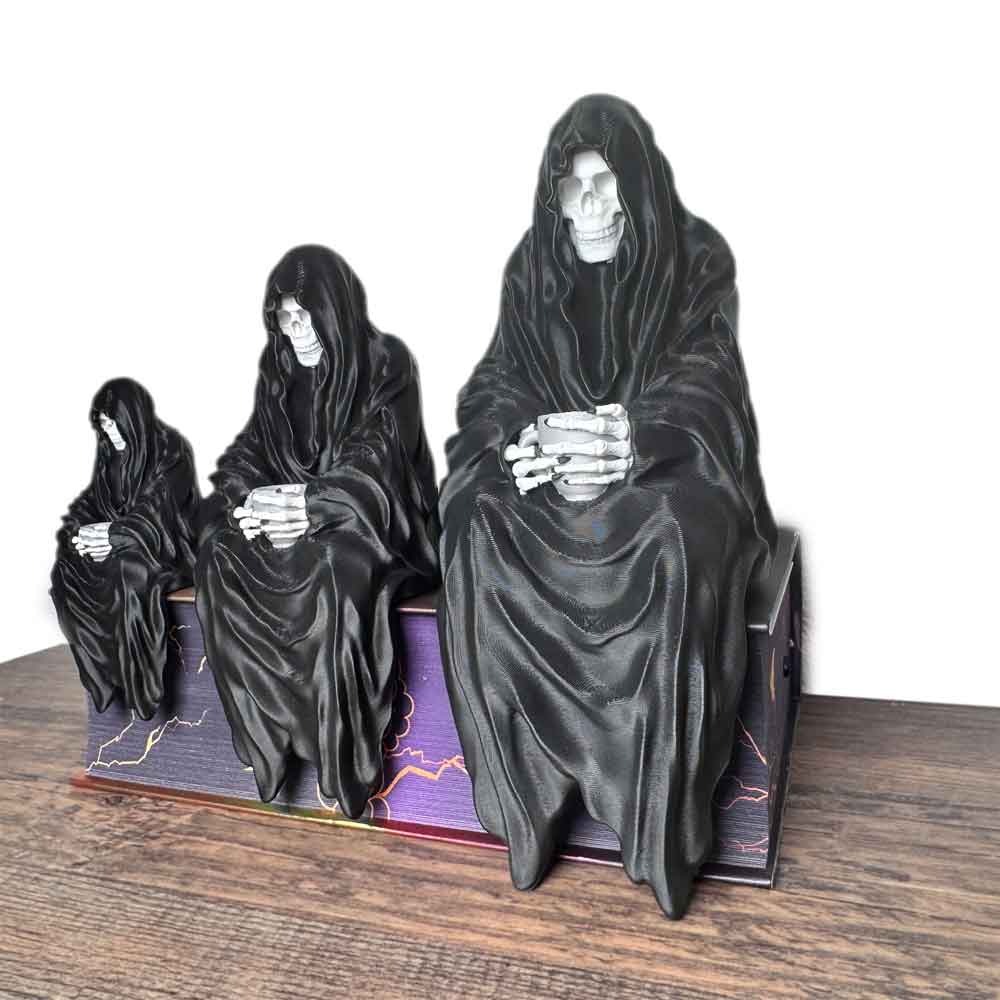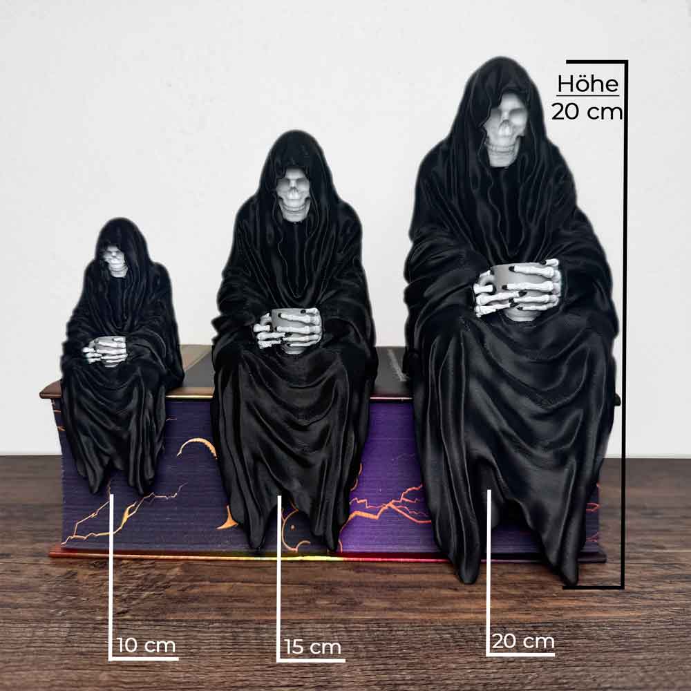 Mystisches Bücherregal-Dekor: Sensenmann sitzend mit Teetasse. Gothic Fantasy Figur – inspiriert von Suriel (ACOTAR).