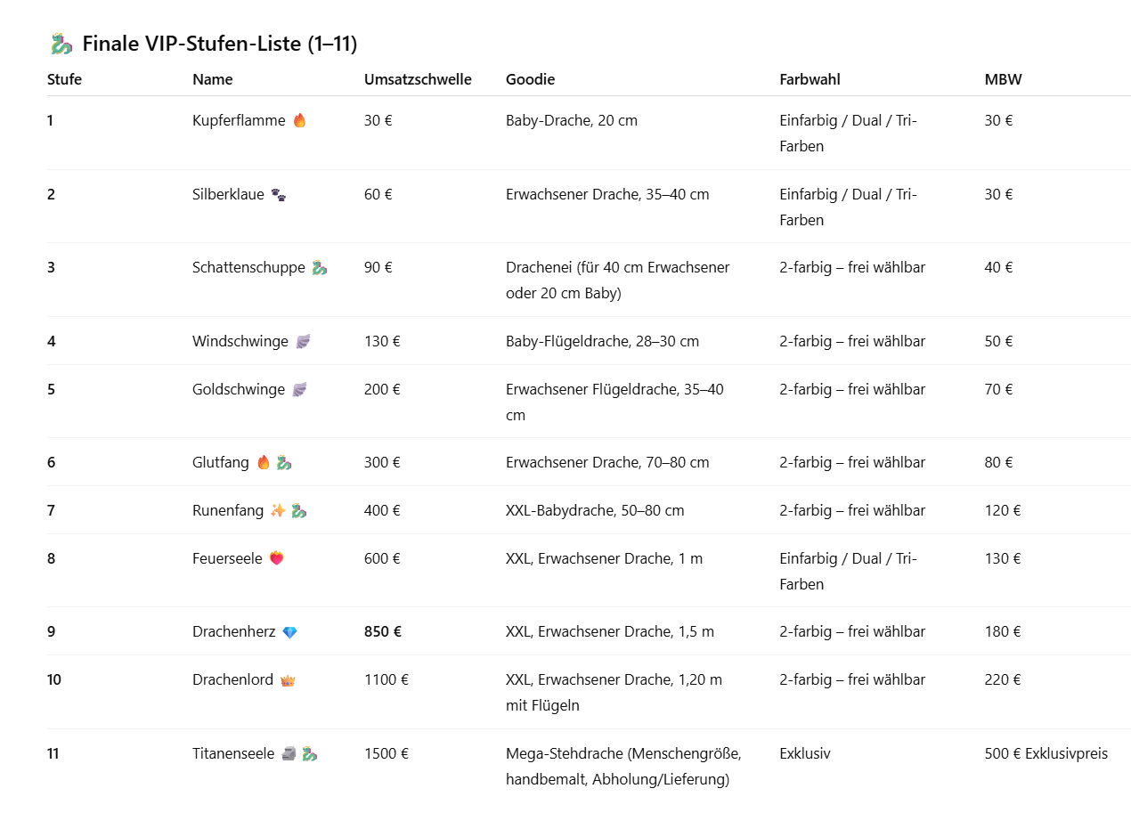 Mit jedem VIP-Level erhĂ€ltst du einen einzigartigen Drachen oder ein besonderes SammlerstĂŒck als Dankeschön fĂŒr deine UnterstĂŒtzung.